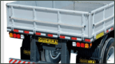 Caixa de carga com 65cm de altura composta de frontal metálica removível com reforços internos, laterais e tampa traseira em madeira com as colunas e travessa metálicas pré-pintadas, acrescentando maior resistência, totalmente removíveis e ripas laterais em alumínio de alta resistência e leveza, com melhor acabamento externo e maior vida útil.